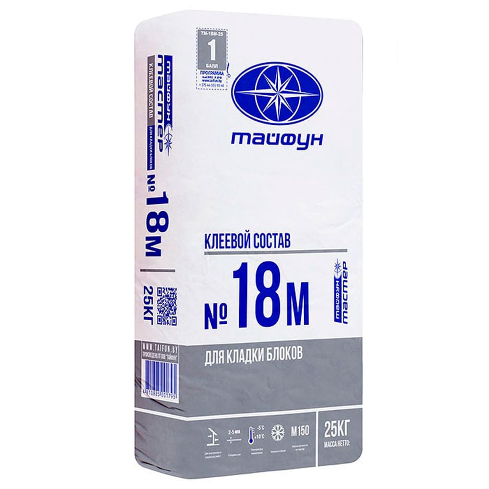 Клеевой состав «Тайфун Мастер»№18М 25кг – применяется для кладки стен и перегородок из газосиликатных, пенобетонных, керамзитобетонных блоков и других штучных стеновых материалов, имеющих высокое водопоглощение. В состав входит водоудерживающая добавка, что обеспечивает гарантированный набор марочной прочности. Также применяется для заполнения выбоин, сколов и трещин в кладке.